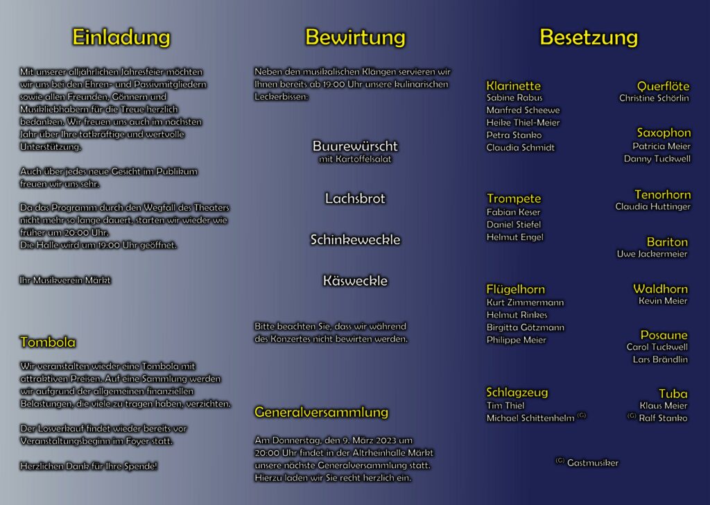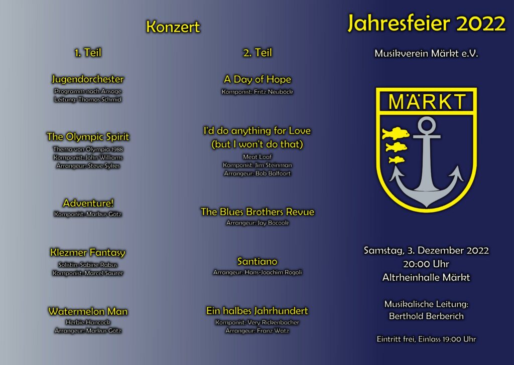 « Alle Veranstaltungen Diese Veranstaltung hat bereits stattgefunden. Jahresfeier 2022 03.12.2022 « Volkstrauertag Generalversammlung Förderverein » Zum Kalender hinzufügen Google Kalender iCalendar Outlook 365 Outlook Live Details Datum: 03.12.2022 Veranstaltungskategorie: Veranstaltung Veranstalter Musikverein Märkt e.V.